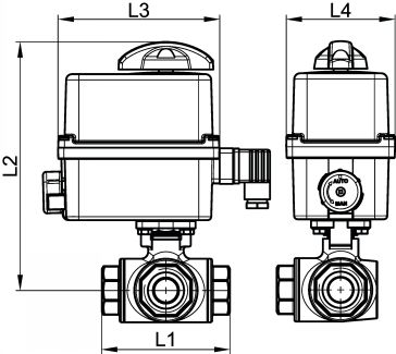 VANNE À BOULE 3 VOIES F/F/F PASSAGE EN T (58217) AVEC ACTIONNEUR ÉLECTRIQUE IP66 180° 3 POSITIONS (50843) (Modelo : 50225)