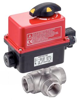 Vanne à boule 3 voies F/F/F passage en T (58217) avec actionneur électrique IP66 180° 3 positions (50843)