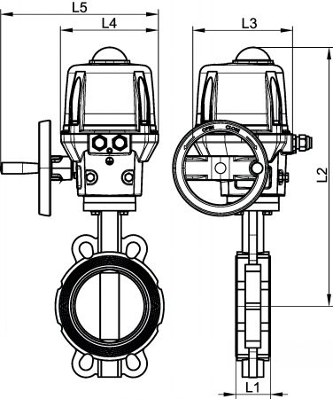 50553 VANNE PAPILLON À OREILLES DE CENTRAGE CORPS FONTE - PAPILLON INOX - JOINT SILICONE AVEC ACTIONNEUR ÉLECTRIQUE IP68 POSITIONNEUR
