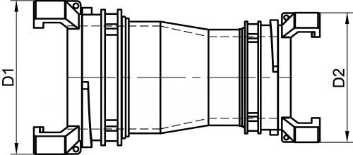 Jonction double de réduction, avec verrous - Joint NBR - Inox 316 - Aluminium> Diamètres disponibles : du DN40-20 au DN100-80> Pression de service (inox) : 16 bar> Pression de service (aluminium) : 10 bar> Température de service : de -20°C à +65°C